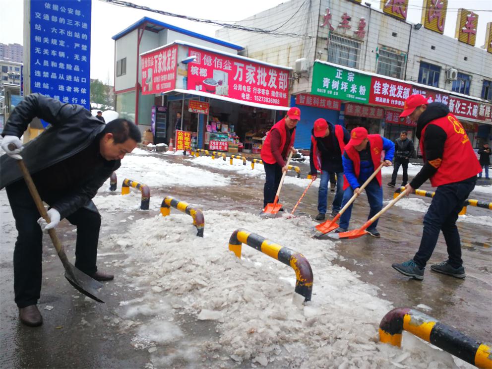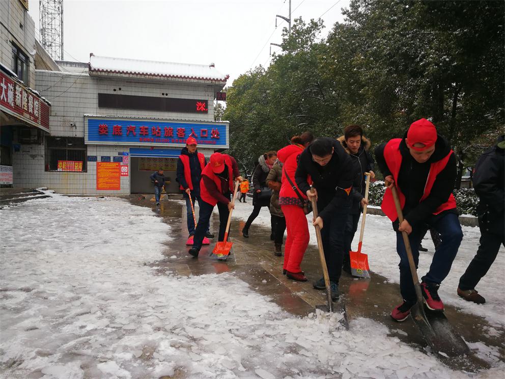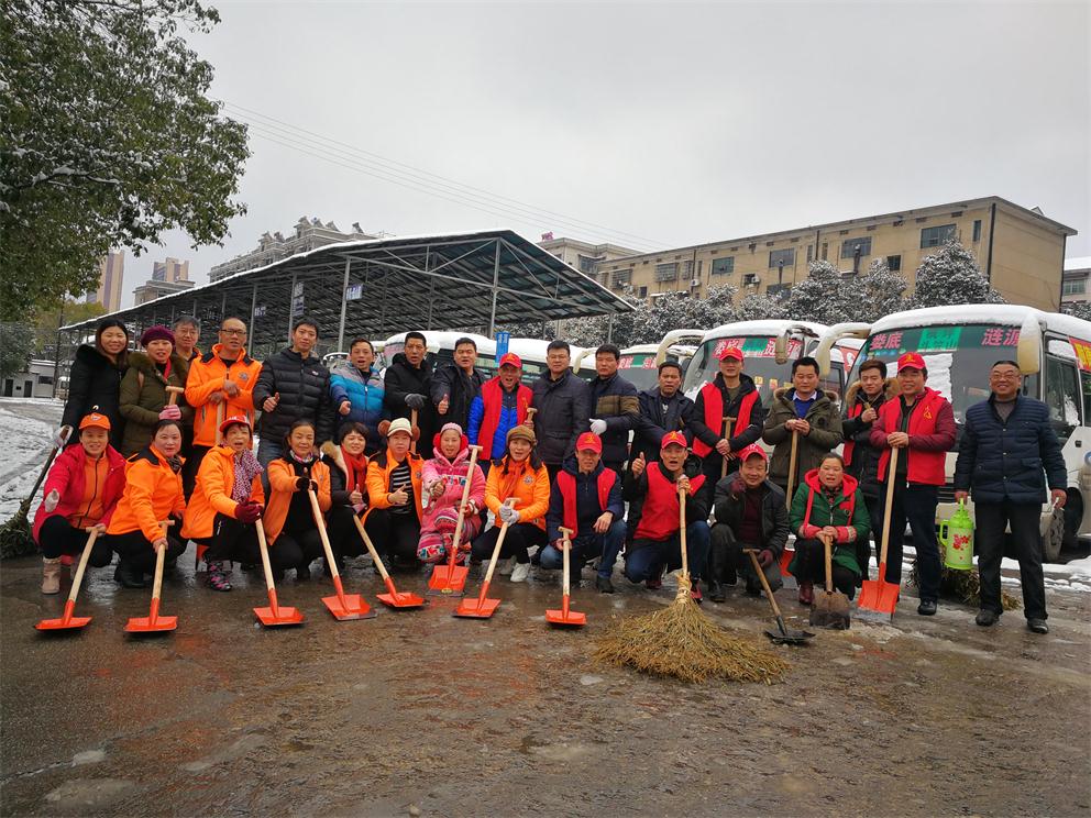 早上八點(diǎn)半,在車站生產(chǎn)副經(jīng)理付育平帶領(lǐng)下,辦公室、調(diào)度、稽查大隊(duì)、營收監(jiān)控隊(duì)、服務(wù)班、安保等部門近20多名志愿者拿著鏟子、鐵鍬和竹掃把等工具,對車站旅客入口處通道、車輛進(jìn)站通道、車站站坪、短途通道、車輛出站通道等地的堅(jiān)冰進(jìn)行鏟除,寒風(fēng)凜冽,積雪厚重,冰塊堅(jiān)硬,但我們的雷鋒志愿者們熱情高漲,大家發(fā)揚(yáng)不怕若不怕累的精神,齊心協(xié)力,分工合作,揮鍬掄鎬,鉚足了勁,發(fā)起了挑戰(zhàn)嚴(yán)冰暴雪的攻堅(jiān)戰(zhàn),在車站奏響了美妙的樂意,汗水濕透了背脊,手掌磨起了血泡,冰雪打濕了鞋襪,大家全然不顧,只看見一頂頂小紅帽在雪地上不停的運(yùn)轉(zhuǎn),很多駕駛員和班線承包人紛紛加入鏟雪隊(duì)伍,婁星微馬隊(duì)的20多名隊(duì)員們在他們隊(duì)長的帶領(lǐng)下也來到車站幫著一起鏟雪除冰,他們橙色的微馬隊(duì)服也是一道道靚麗的風(fēng)景線。大家都有一個(gè)共同的名字——學(xué)雷鋒志愿者!他們的一言一行彰顯真情,贏得了過路市民的連聲稱贊!